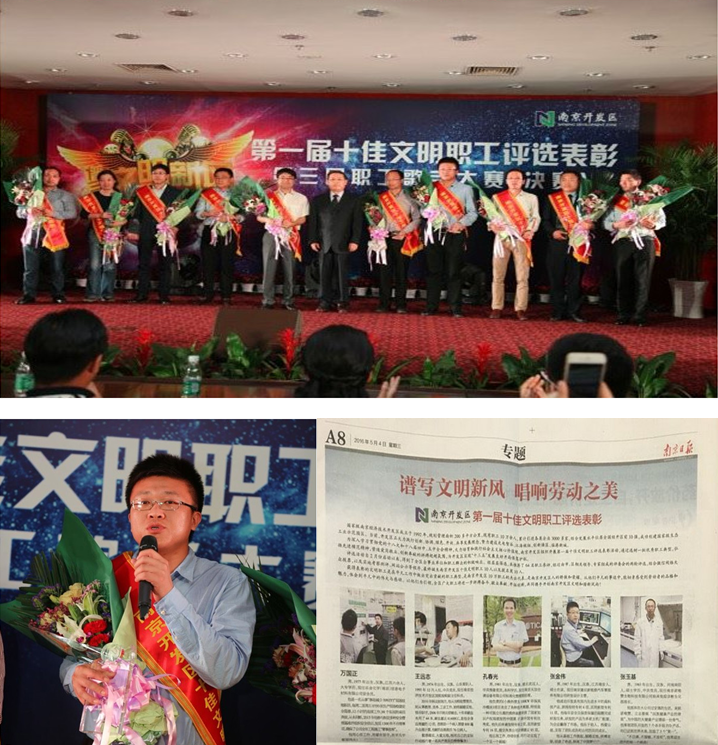 评选活动自2016年2月份启动以来,经层层筛选,通过严格、公开的申报,一共推荐了64名职工参评;经过市、区领导和专家组成评委会的两轮评选,结合微信网络大众投票,以及实地考察测评、网站公示等一系列程序,南京开发区第一届十佳文明职工在4月29日正式诞生。南京康尼新能源公司设计主管“张金伟”获得这一殊荣,并参加了5月4日在开发区管委会举行的颁奖仪式。在此,我们表示衷心的祝贺。